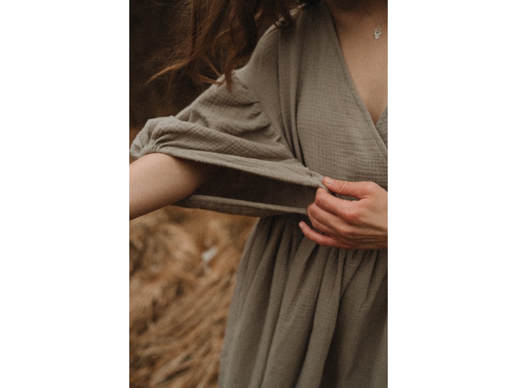 Horní díl je křížený a to z vícero důvodů. Jednak jsem nechtěla klasický V výstřih a (a to především) moc jsem si přála, aby v nich tančily i kojící Bohyně. Právě díky překrývajícím se vrstvám je možné pohodlně nakojit. Výstřih je hluboký tak nějak ... rafinovaně. Na první pohled není příliš hluboký, však při různých pohybech občasně naskýtá náramnou podívanou. Neodhalí však příliš, aby směla fantazie okolí pracovat na maximum.